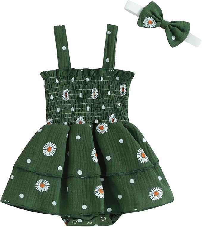 Infant Baby Girls Bodysuit Rompers Dress Newborn Short Sleeve Daisy Romper with Headband Summer Clothes Set