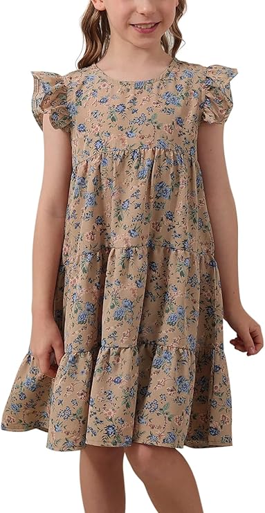 Girls Floral Print Ruffle Sleeve Tiered Loose Fit Pleated Swing Midi Dress 4-14T