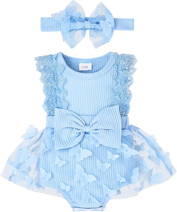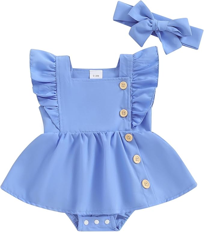 Toddler Baby Girl Summer Clothes Ruffled Sleeves Solid Color Flower Romper Dress Newborn Outfits with Headband