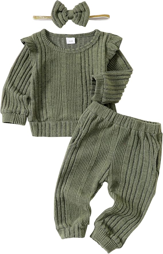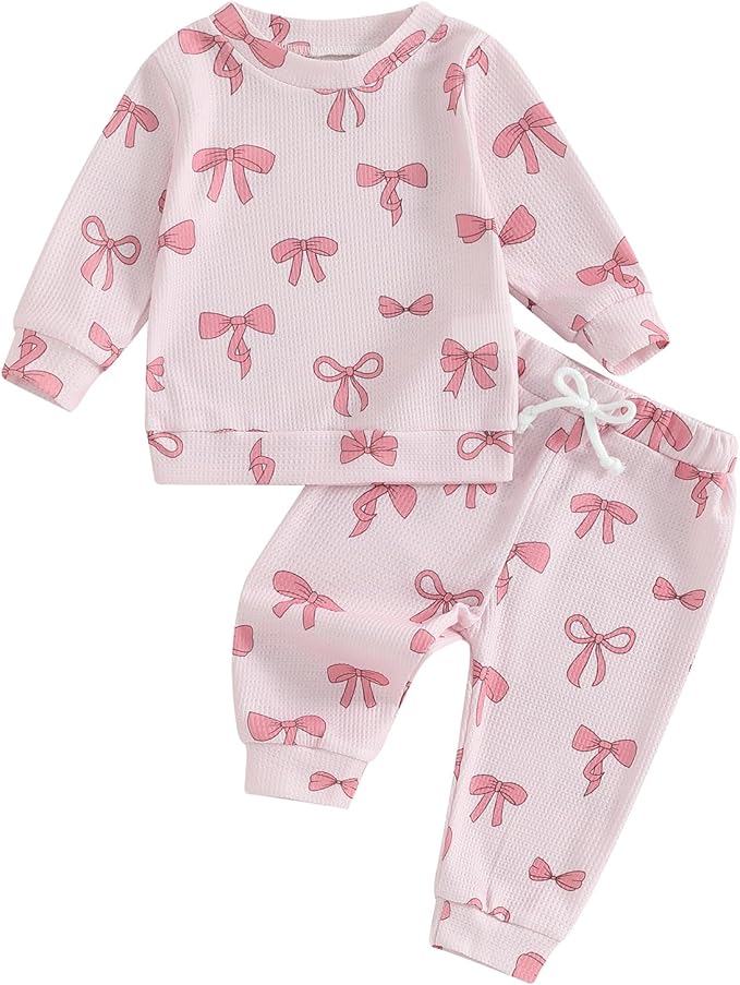 Fall Baby Girl Clothes Ruffle Long Sleeve Bow Print Sweatshirt Top Pants Set 2Pcs Waffle Knit Outfit