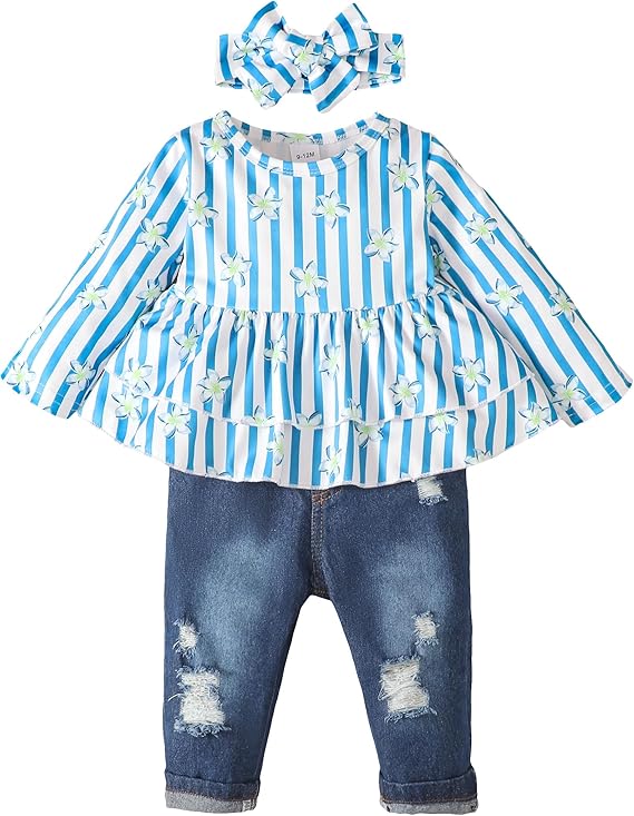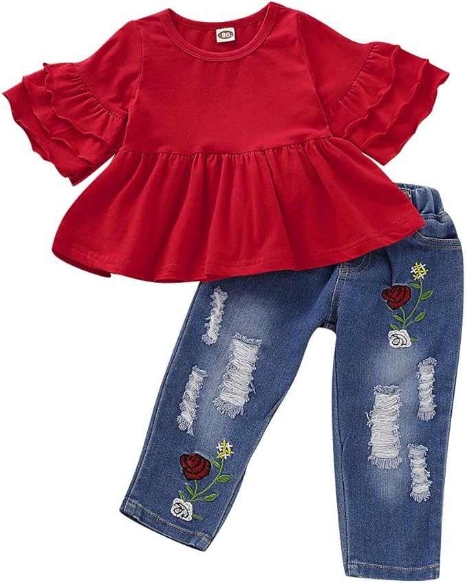 Baby Girl Clothes Toddler Girl Outfit Infant Ruffle Shirt Denim Ripped Jeans Cute Clothing Set