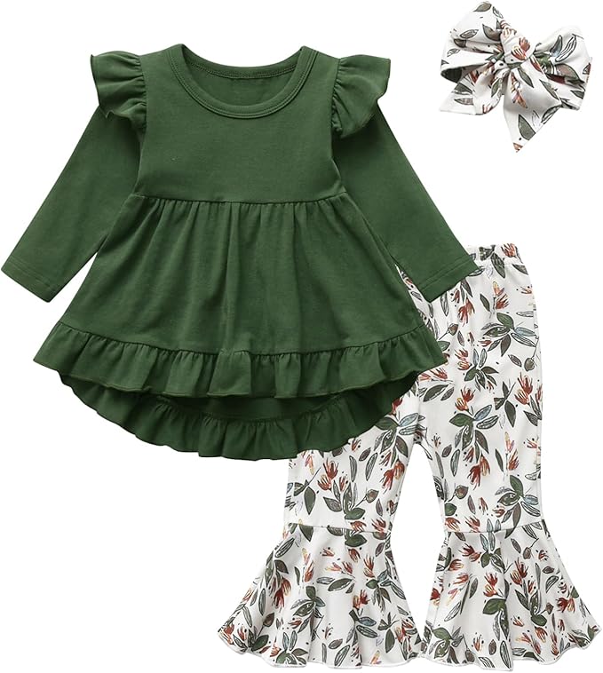 Toddler Baby Girl Clothes Solid Color Long Sleeve Ruffle Tops Floral Bell-Bottoms Pants and Headband Outfits Set