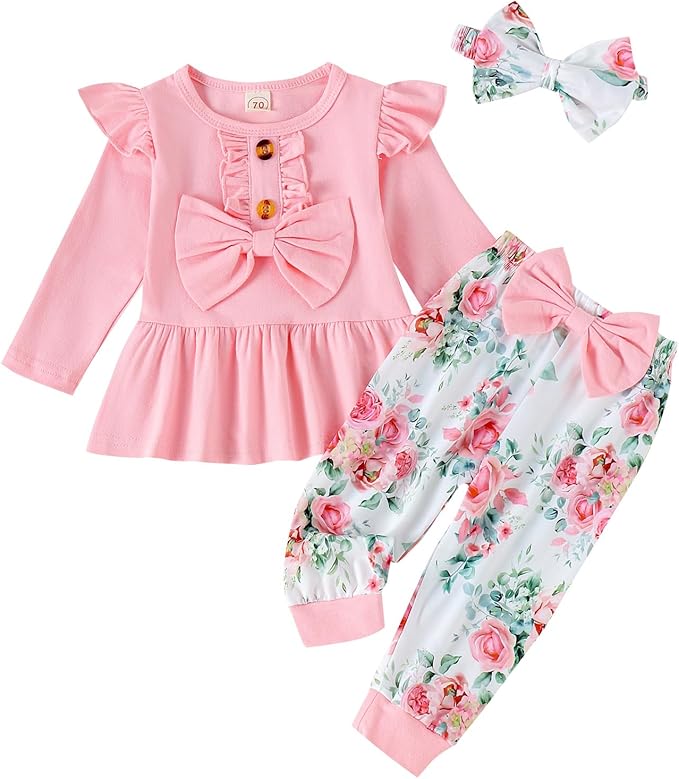 Baby Girl Clothes Infant Toddler Outfits Ruffle Top + Floral Pants + Bow Headband Set Baby Girls' Clothing