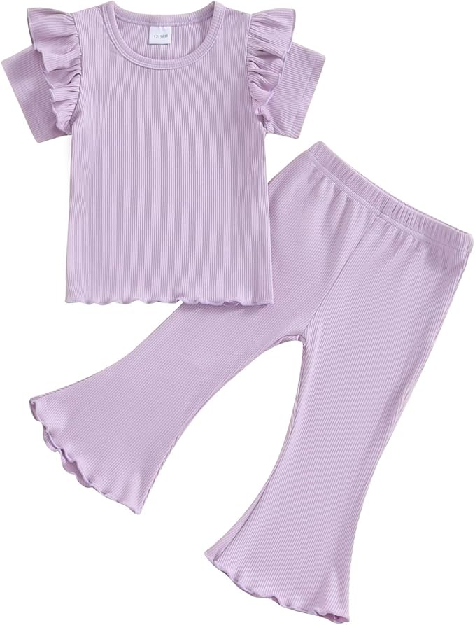 Toddler Baby Girl Summer Clothes Set Ruffle Knit Ribbed Short Sleeves T-Shirts Tops Pants 2Pcs Outfits 0-5T