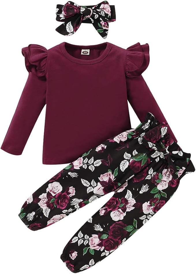 3Pcs Toddler Girl Clothes,Solid Color Long Sleeves Ruffle Top+ Floral Pant +Floral Headband