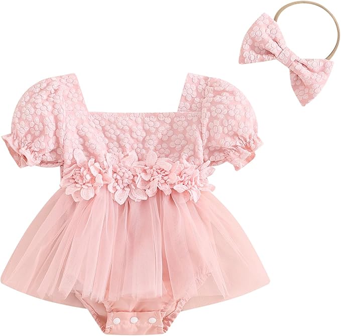 Toddler Baby Girl Summer Romper Dress Short Puff Sleeve 0 3 6 12 18 Months Clothes Jumpsuit + Headband