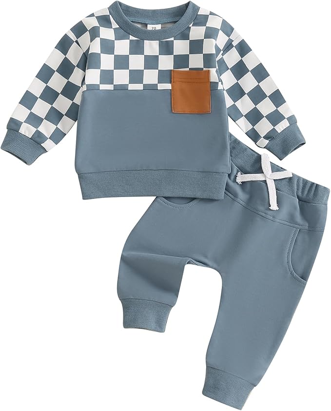 Toddler Baby Boy Girl Clothes Checkered Color Block Long Sleeve Sweatshirt with Pants Set 2Pcs Fall Winter Outfits